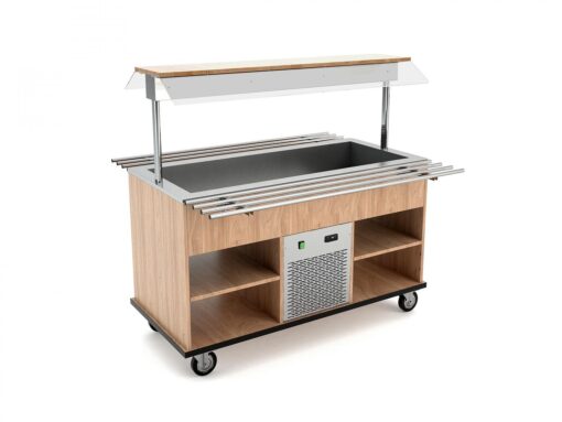 Refrigerated buffet with laminated wood structure and chromed details. Capacity 4 GN 1/1. Fix Plexyglass sneezeguard. Upper neon lighting. Stainless steel well, 18 cm. deep, equipped with drain cock, with static refrigeration. Temperature controlled and regulated by digital thermostat. 2 Castors with brake Ø 125 mm.